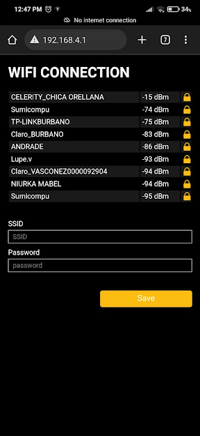- Seleccionar la red WiFi y colocar la respectiva contraseña para luego avanzar presionando Save.